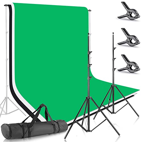 • KIT INCLUDEDS: (1)8.5x10feet/2.6x3meters(HeightxWidth) Background Stand Support System; (3)10x20ft/3x6M(WidthxLength) Backdrops(White/Black/Green); (3)3.75inches/9.5cm Background Clamps; (1)Carrying Bag; It can sturdily hold muslin, canvas, paper and be suitable for using at home or any professional studio